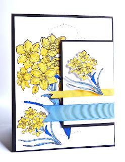Today's card was made for two challenge: the sketch challenge on scs, as well as the the colour queen challenge. The colors are daffodil, black, white, brocade blue, and brilliant blue. The floral images are from Flourishes. I did my coloring with markers and fussy cut out the smaller daffodils. I'm not sure why I like to torture myself like that. :>)